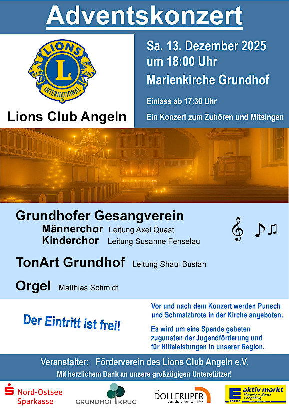Adventskonzert des Männerchors und des Kinder- und Jugendchors gemeinsam mit dem Grundhofer Chor Tonart und Organist Matthias Schmidt in der St. Marienkirche in Grundhof. Einlass ab 17:30 Uhr. Freier Eintritt. Gastgeber ist der Lions Club Angeln.